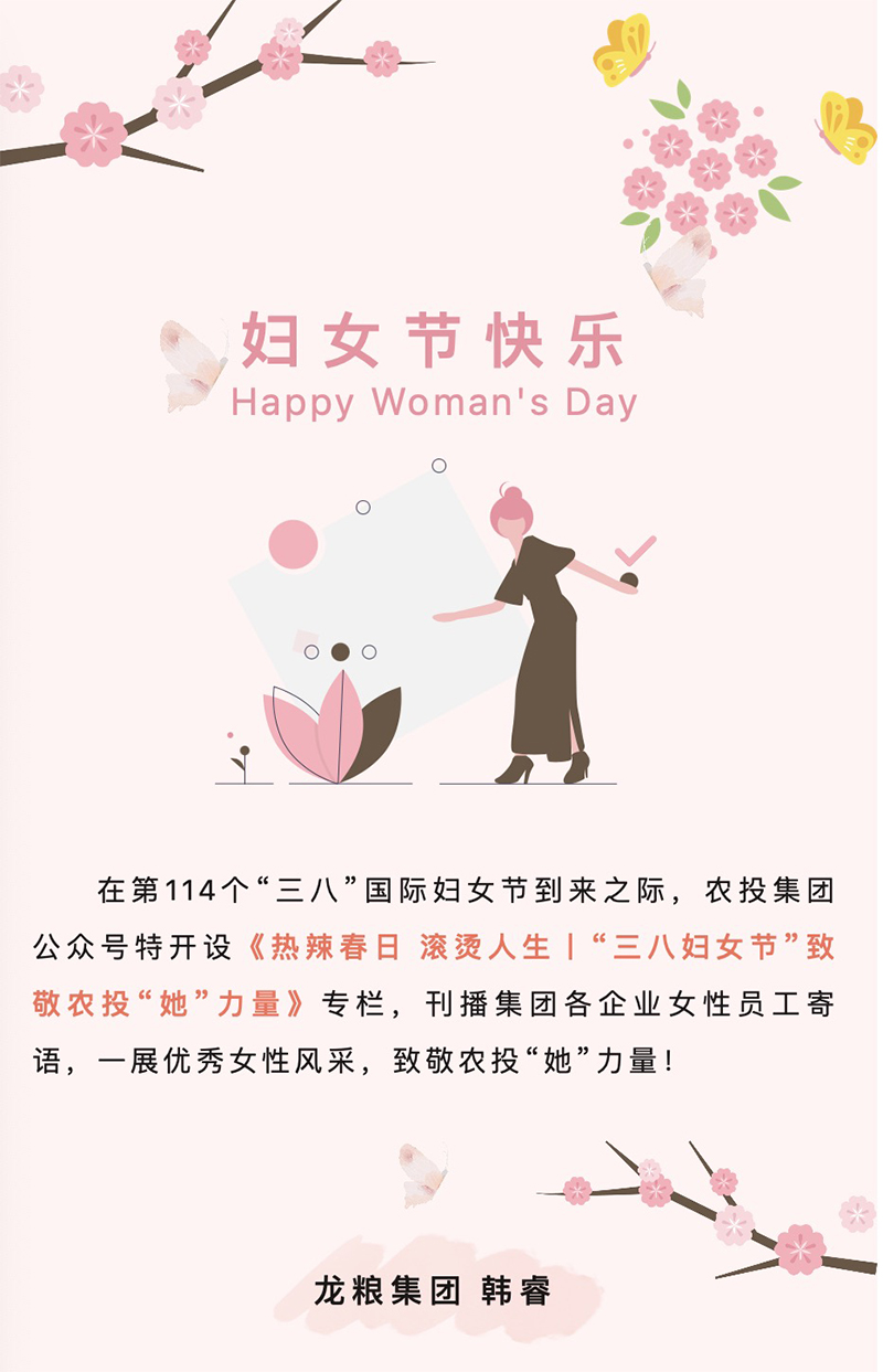 農(nóng)投生物 劉佳欣 三月春風(fēng)暖,萬象展新顏。在這春意盎然的季節(jié)里,我們滿懷希望迎來了第114個“三八”國際勞動婦女節(jié)。堅強(qiáng)與溫柔并存,作為新時代的女性,我們一直以力量和勇氣,來面對職場和生活中的挑戰(zhàn)。積極向上,完善自我,堅定信念,懷以熱情,向世界展示自己的價值。今后,我也會以優(yōu)雅的態(tài)度面對生活的挑戰(zhàn),以微笑的力量溫暖人心,在堅定理想信念中激揚(yáng)巾幗之志,在弘揚(yáng)文明新風(fēng)中展現(xiàn)巾幗之美。值此節(jié)日,祝愿所有女性永遠(yuǎn)熱愛! 農(nóng)投產(chǎn)融 楊麗杰 作為一個當(dāng)代女性,我感到幸福和驕傲,當(dāng)下正處于變革時代,女性的地位越來越受到重視,作為新時代的女性更有機(jī)會追求自己的幸福和理想。 女性要有自己的夢想,要不斷提升自己的素養(yǎng)和能力,要學(xué)會突破自己,充分發(fā)揮自己的才能,展現(xiàn)自己的價值,堅持不懈,努力奮斗,敢于面對挑戰(zhàn)與困難,實(shí)現(xiàn)自己的夢想和追求,過上幸福自由的生活。 儲備糧 李微 毛澤東主席說:女人也頂半邊天。自古以來,從婦好上馬為將開疆拓土,到王昭君出塞奠定和平之基,建功立業(yè)巾幗不讓須眉。我們都擁有著無與倫比的獨(dú)特的力量,這種力量源于女同胞天生的耐心、細(xì)心、勇敢和堅韌,在省級直屬糧庫管理一線上,在省級儲備糧垂直管理體系建立上,在省級儲備糧綠色倉儲提升工程建設(shè)上,都有著女同胞忙碌的身影,都凝聚著我們的心血和汗水。 在未來的工作中,我將不斷提升自己的綜合素質(zhì),通過不斷學(xué)習(xí)、實(shí)踐和鍛煉,增強(qiáng)自己的能力和技能。將以更加積極的姿態(tài)投身于工作和生活中,追求卓越,精益求精,為農(nóng)投集團(tuán)和儲備糧公司高質(zhì)量發(fā)展把薪助火,添磚加瓦。 編輯:張玉彬 編審:侯慶雄 樊成博