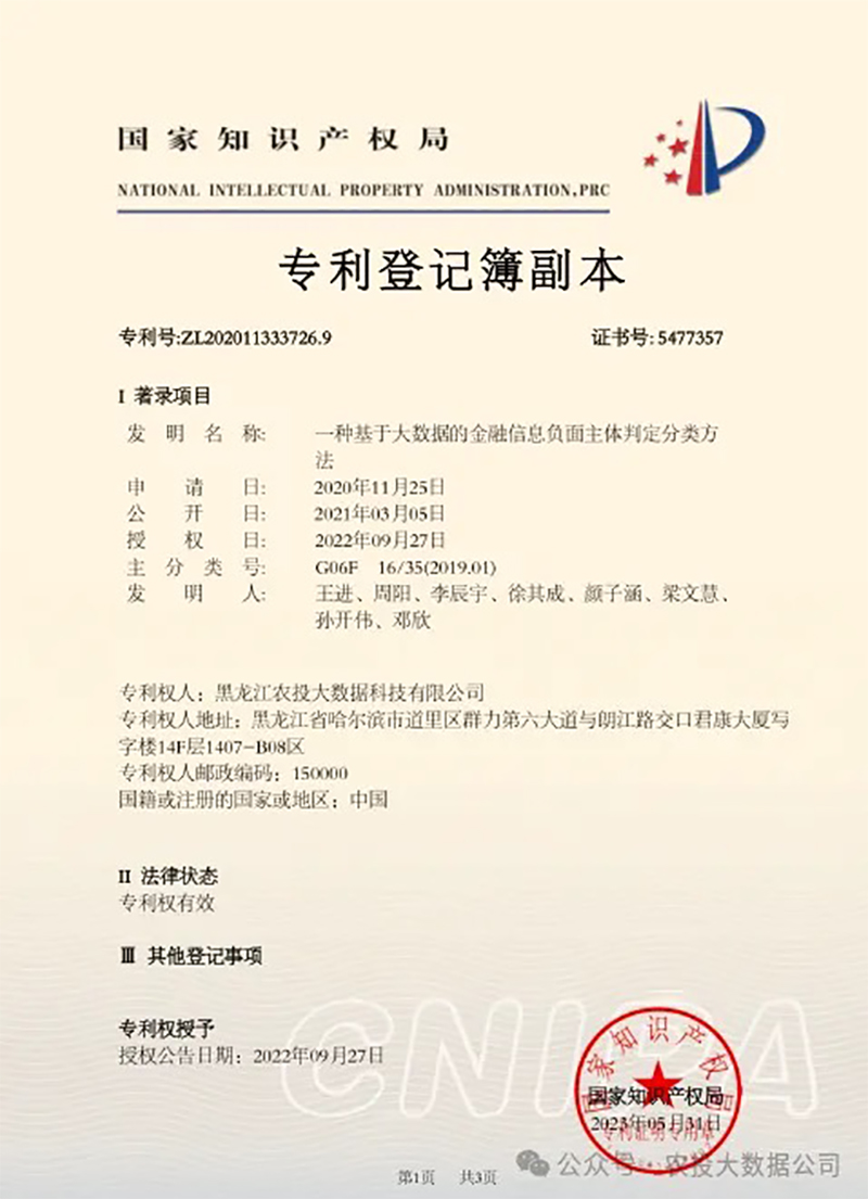 農(nóng)投集團(tuán)大數(shù)據(jù)公司緊緊圍繞“金融+科技+農(nóng)業(yè)”領(lǐng)域的創(chuàng)新模式,通過不斷加強(qiáng)自主創(chuàng)新能力,形成了一批具有自主知識產(chǎn)權(quán)的專用技術(shù)和產(chǎn)品。截至目前,大數(shù)據(jù)公司已擁有軟件著作權(quán)91個(gè),商標(biāo)12個(gè),發(fā)明專利申請7個(gè),其中一項(xiàng)發(fā)明專利已成功轉(zhuǎn)讓,另有3項(xiàng)處于申請階段,3項(xiàng)處于公示期。