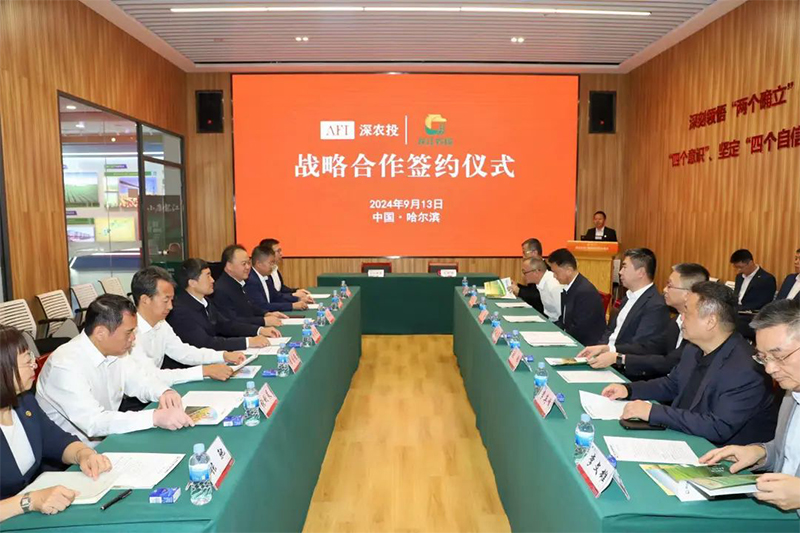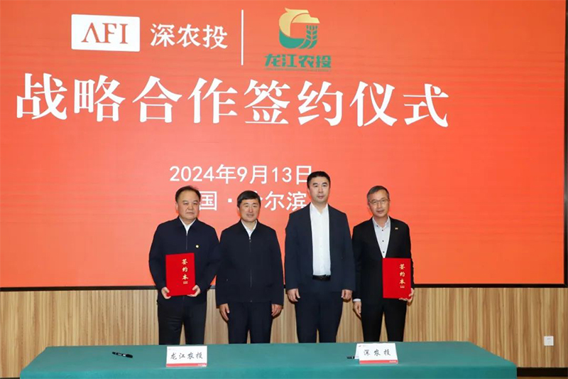 9月13日,黑龍江省農(nóng)業(yè)投資集團(tuán)有限公司(以下簡稱龍江農(nóng)投)與深圳農(nóng)業(yè)與食品投資控股集團(tuán)有限公司(以下簡稱深農(nóng)投)在深圳(哈爾濱)產(chǎn)業(yè)園舉行戰(zhàn)略合作簽約儀式。深圳市政府黨組成員、副市長代金濤,黑龍江省國資委黨委委員、副主任張玉福出席活動(dòng),深農(nóng)投黨委書記、董事長黃偉,龍江農(nóng)投黨委書記、董事長常玉春分別代表各自企業(yè)簽約。