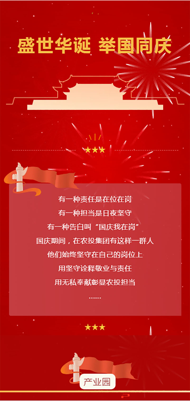 國慶期間,農(nóng)投數(shù)字農(nóng)業(yè)產(chǎn)業(yè)園人用雙肩扛起責任,用汗水致敬職責,用初心堅守崗位,用奮斗書寫華章。產(chǎn)業(yè)園公司以“創(chuàng)新發(fā)展、開放共享、互惠共贏”為經(jīng)營理念,全面踐行“讓龍江農(nóng)民更幸福,讓龍江農(nóng)業(yè)更強大,讓龍江農(nóng)產(chǎn)品更有市場競爭力”的農(nóng)投使命,為全省優(yōu)質(zhì)農(nóng)產(chǎn)品企業(yè)搭建共享式農(nóng)產(chǎn)品品牌價值及市場影響力,接續(xù)奮斗,再創(chuàng)輝煌!