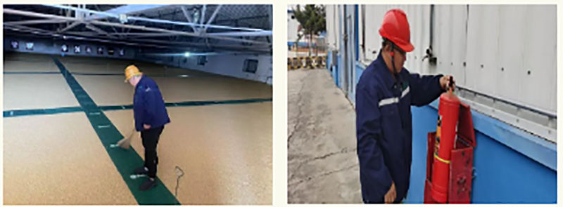 保管員清掃糧面衛(wèi)生確保糧倉內(nèi)干凈 安全保衛(wèi)部員工檢查滅火器