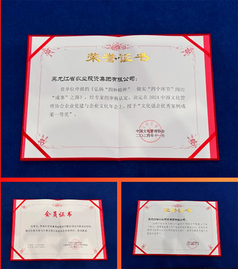 為貫徹黨的二十屆三中全會(huì)精神,進(jìn)一步推進(jìn)新時(shí)期企業(yè)黨建、文化建設(shè)深入有效開(kāi)展,11月12日-14日,2024中國(guó)文化管理協(xié)會(huì)企業(yè)黨建與企業(yè)文化年會(huì)在杭州召開(kāi)。會(huì)上,發(fā)布企業(yè)黨建與企業(yè)文化系列實(shí)踐創(chuàng)新成果,舉辦“第十一屆”最美企業(yè)之聲展播活動(dòng)。由黑龍江省農(nóng)業(yè)投資集團(tuán)有限公司(以下簡(jiǎn)稱農(nóng)投集團(tuán))選送的《弘揚(yáng)“四種精神” 做實(shí)“四個(gè)環(huán)節(jié)” 闖出“成事”之路》榮獲文化強(qiáng)企優(yōu)秀案例成果一等獎(jiǎng),《農(nóng)投企業(yè)文化規(guī)范指導(dǎo)手冊(cè)》被評(píng)為“最美傳播之聲”銀獎(jiǎng)代言作品。