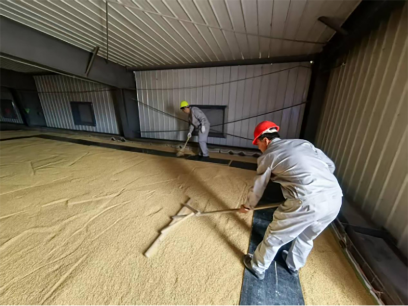 △樺川縣創(chuàng)業(yè)糧庫派員工平整糧面,確保糧食不受潮、不生蟲、不霉變。