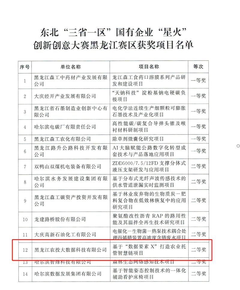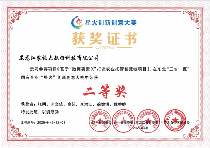 東北“三省一區(qū)”山水相連、人文相親、產(chǎn)業(yè)相融,國(guó)資國(guó)企發(fā)展資源優(yōu)勢(shì)和條件機(jī)遇相似,在科技創(chuàng)新合作有著深厚基礎(chǔ)。 2024年11月至2025年4月,遼寧省國(guó)資委、吉林省國(guó)資委、黑龍江省國(guó)資委、內(nèi)蒙古自治區(qū)國(guó)資委聯(lián)合舉辦了東北“三省一區(qū)”國(guó)有企業(yè)“星火”創(chuàng)新創(chuàng)意大賽,“三省一區(qū)”的161個(gè)項(xiàng)目分獲一、二、三等獎(jiǎng)。農(nóng)投大數(shù)據(jù)公司憑借“基于‘?dāng)?shù)據(jù)要素×’打造農(nóng)業(yè)托管智慧鏈項(xiàng)目”從全省百余個(gè)參賽項(xiàng)目中脫穎而出,榮獲大賽二等獎(jiǎng)。