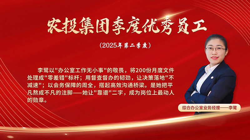 為表彰先進(jìn),樹立典型,有效激發(fā)農(nóng)投集團(tuán)總部全體員工的工作熱情、主動性和創(chuàng)造力,農(nóng)投集團(tuán)總部對季度優(yōu)秀部門和優(yōu)秀員工開展評選工作。集團(tuán)黨委組織部(人力資源部)被評為集團(tuán)總部2025年第二季度“優(yōu)秀部門”、綜合辦公室(黨委辦公室、董事會辦公室、總經(jīng)理辦公室)業(yè)務(wù)經(jīng)理李鷺被評為集團(tuán)總部2025年第二季度“優(yōu)秀員工”。